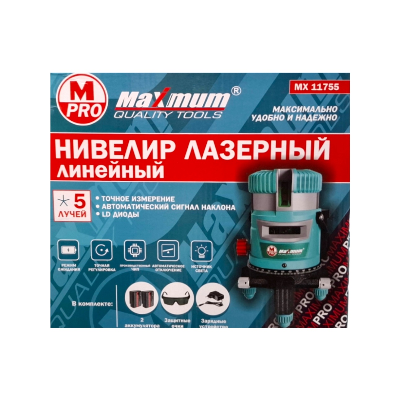 В комплекте поставляется: уровень, кейс, очки, литий-ионная батарея АА 3 шт., зарядное устройство.