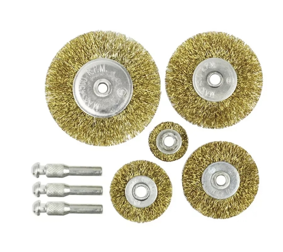 В комплекте 5 щеток разного диаметра (25 мм, 35 мм, 50 мм, 75 мм) для обработки как небольших участков, так и обширных поверхностей.